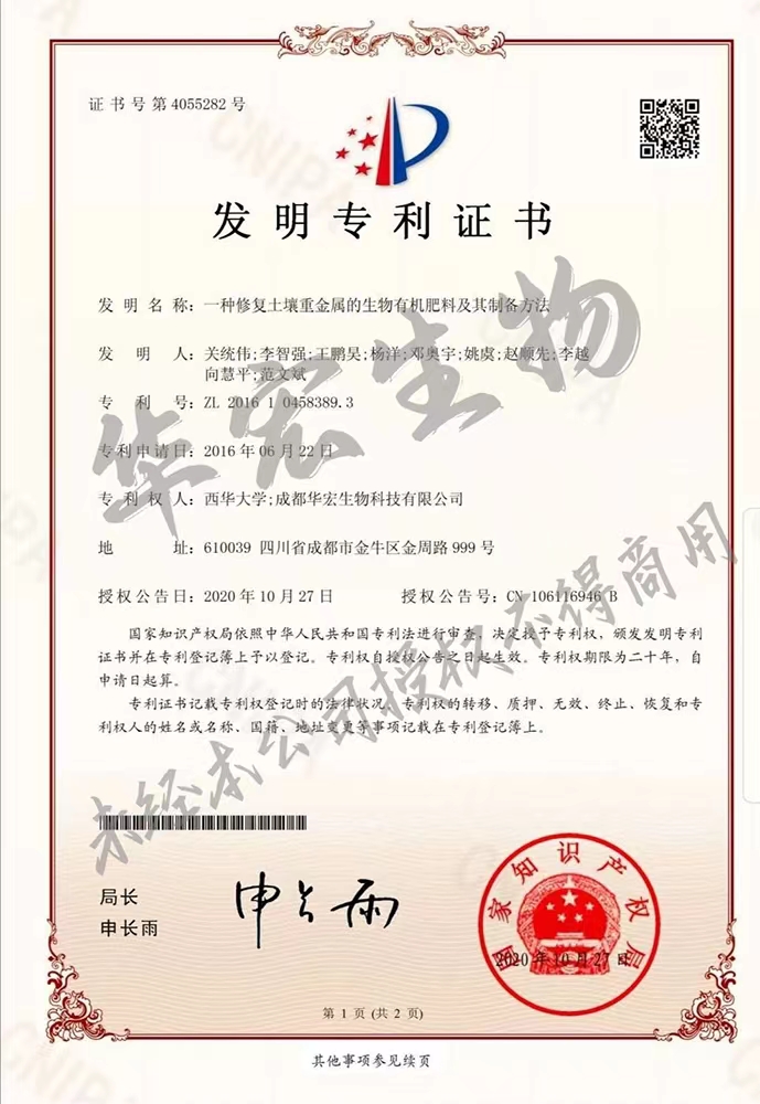 一種修復(fù)土壤重金屬的生物有機(jī)肥料及其制備方法專利證書(shū)